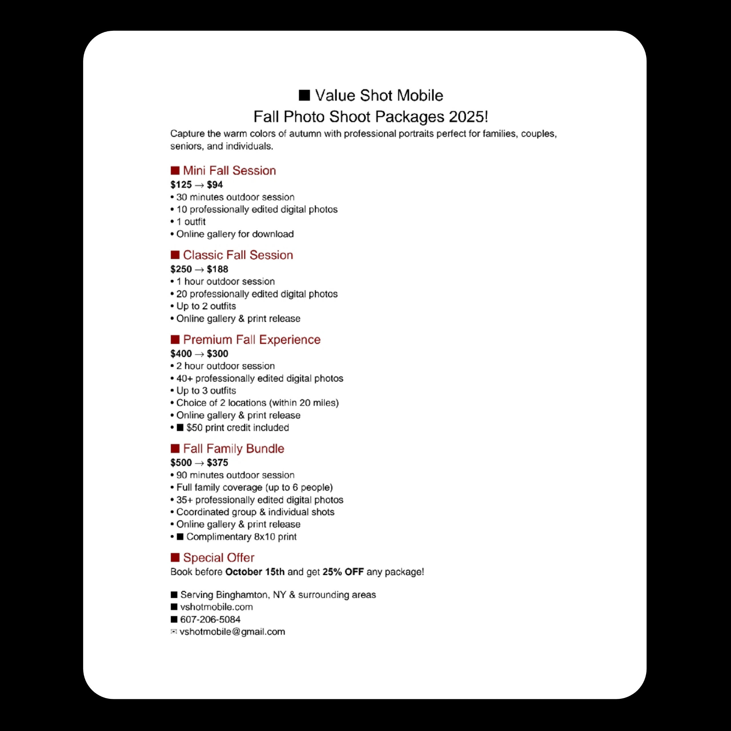 With over a decade of photography experience, Value Shot Mobile brings the studio to you wherever you are. We specialize in capturing life's most meaningful moments with creativity, precision, and heart. Whether it’s a personal portrait, event coverage, or branded content, we provide everything needed to tell your visual story through the lens. Our mission is simple: to preserve moments in time with high-quality, mobile photography that meets you where life happens.